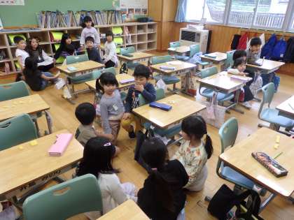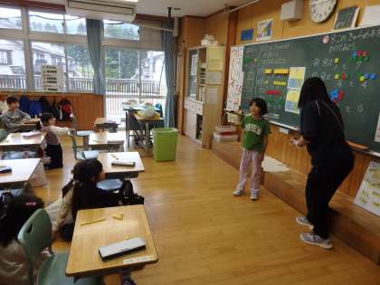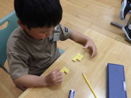 5/9 8はいくつといくつに分けられる? 公開日 2024/05/09 更新日 2024/05/09 教育活動 1年1組の3時間目は算数の授業でした。「8を2つに分けると、いくつといくつに分けられるか」考えました。まずは、1人1人がブロックを使って分けます。その後、同じ分け方をした人を探して、グループを作ります。グループの代表の子が前に出てきて、どういう分け方をしたのかみんなに説明をしました。 いいね(0)