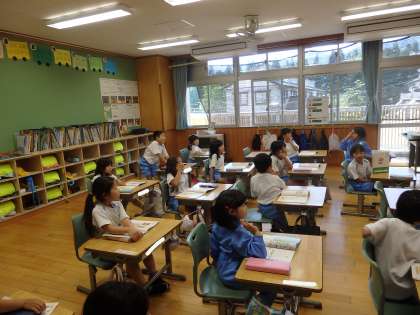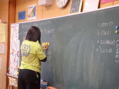 1年1組の1時間目は算数の授業でした。まずは、前の授業の復習で「8はいくつといくつに分けられるか」を確認しました。そして、今日の学習「9はいくつといくつに分けられるか」です。黒板に貼られた9個のマグネットを、先生が子どもたちに見えないように何個か取ります。子どもたちは、残ったマグネットの数から、先生がマグネットを何個取ったのか考えます。引き算の考え方も入ってきますが、子どもたちは楽しそうに取り組んでいました。