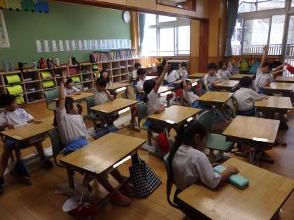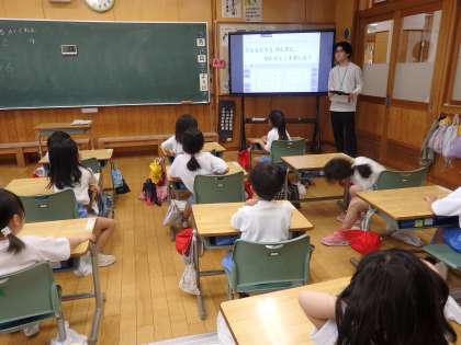 1年1組の1時間目は学活の授業でした。昨日、「スマイルになるために何を頑張るか」について意見を出し合いましたが、出された意見を基に3つの学級目標の案が上がりました。多数決で決めていました。どんな学級目標になったのか、お子さんにお聞きください。