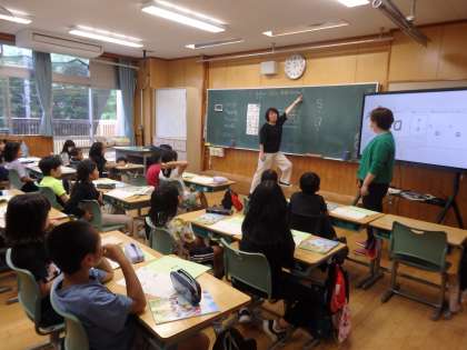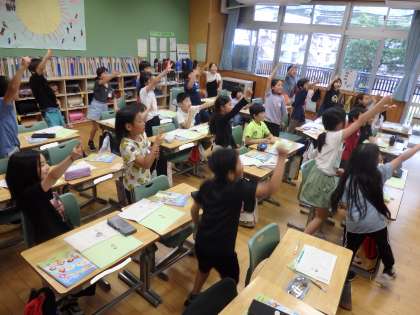 5/16 ワン、ツー、スリー! 公開日 2024/05/16 更新日 2024/05/16 国際科 3年生の5時間目は国際科の授業でした。まずは、「s」と「a」の発音について学習しました。次に数字の学習です。1から20までの数字の言い方を学習しました。最後に、英語でジャンケン大会です。先生を相手に「ロック、ペイパー、シザーズ、ワン、ツー、スリー!」最後に隣の人とペアでジャンケンを市、勝って数を数えていきました。かなり盛り上がったジャンケン大会でした。 いいね(0)