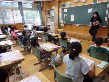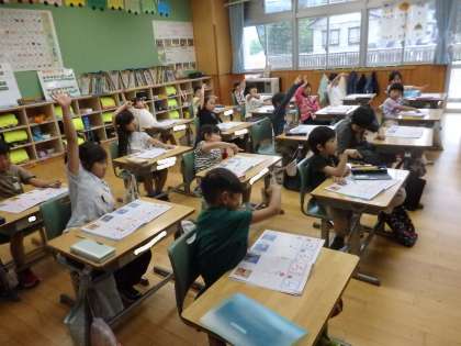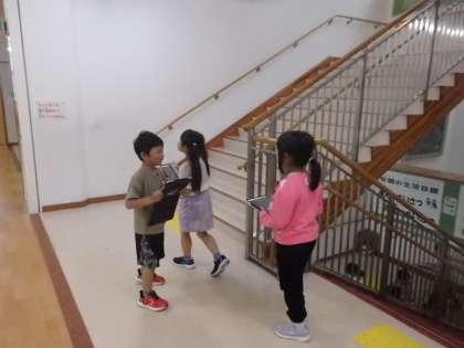 1年1組の3時間目は国語の授業でした。ひらがなの「ら」の学習です。書くときの注意するところを確認して、空書きをしました。腕をいっぱいに伸ばして大きく「ら」を書いていました。練習帳に練習した後は、ひらがなを使ったクイズづくりです。2年生に出題するようです。最後に、クイズの答えになるものの写真を撮るために、iPadを持って校内のいろいろな物を写真に撮っていました。