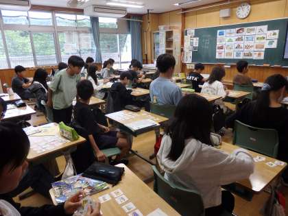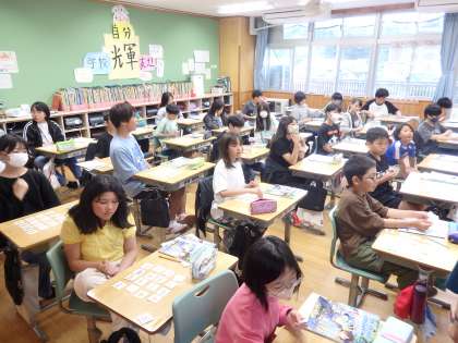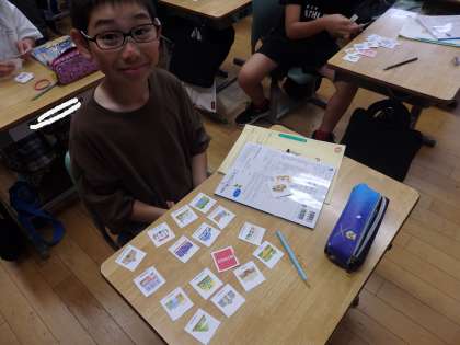 5/17 施設名でビンゴ 公開日 2024/05/17 更新日 2024/05/17 国際科 6年生の3時間目は国際科の授業でした。公園や図書館、駅など施設を表す英単語に慣れるために、ビンゴを行っていました。縦4枚、横4枚にカードを並べ、先生が言った単語を裏返していきます。6個目の単語でビンゴになっている子がいました。 いいね(0)