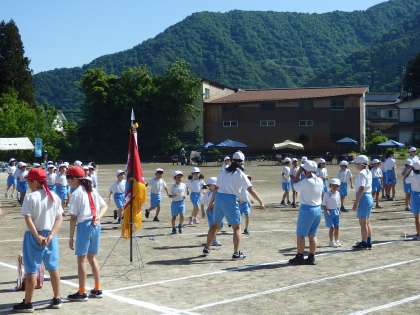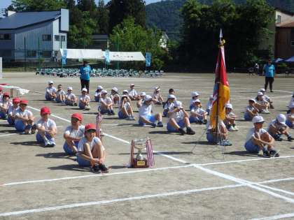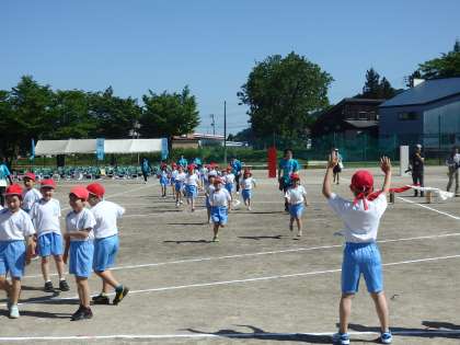 応援席に全員が揃ったら、応援リーダーの呼びかけで全員が開会式の隊形に並びます。応援席からダッシュで並ぶ五小っ子、壮観な光景でした。応援リーダーの「〇年生!ここに並んで!」という声もよかったです。