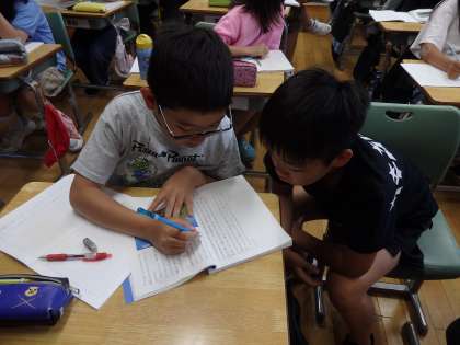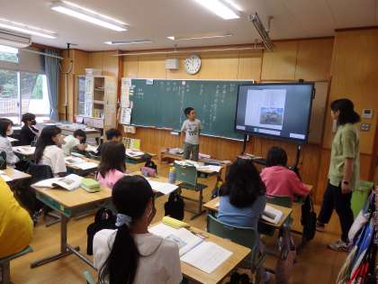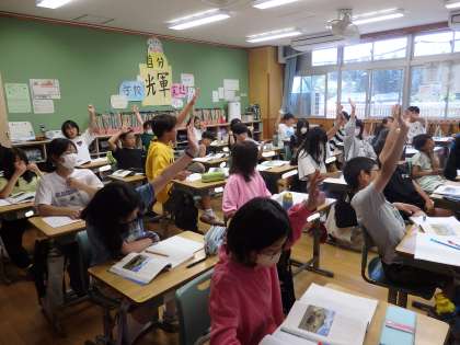 6年生の2時間目は国語の授業でした。「イースター島にはなぜ森林がないのか」の内容の読み取りです。この評論文の結論はどの段落に書いてあり、どんな内容で書かれているのかを考え、意見を出し合いました。