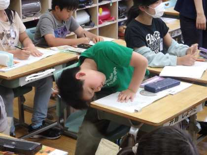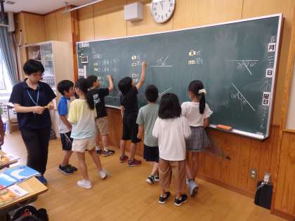 5/23 角度は何度? 公開日 2024/05/23 更新日 2024/05/23 教育活動 4年生の3時間目は算数の授業でした。写真で分かりますでしょうか。2つの直線が交わってできる2つの角度。1つは何度かが示され、もう一つの角度を求める問題です。よくテストで見る問題ですね。(中学校の定期テストや高校入試でも出ます)体をひねって上下逆にして見ようとしたり、分度器越しに黒板を見て測ろうとしたりする子もいましたが、1人の子の「計算でできるね。」の一言で、全員「あ〜!」 いいね(0)