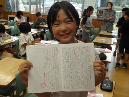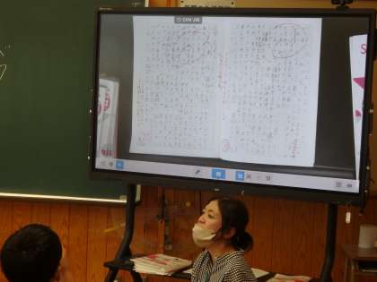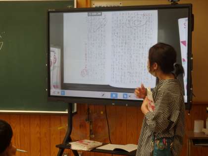 5年生の4時間目は国語の授業でした。前の授業で、「インターネットの冒険」の筆者の主張に対しての自分の考えをノートに書きました。今日の授業では、その中でもよく書けている子の主張文が紹介されました。ノートを電子黒板に映して、提示しています。筆者の考えに賛成か反対かだけでなく、自分がこれまでに見たり聞いたりしたこと、インターネットの危険なところに対しての対策なども書けている子が紹介されていました。写真で見えますでしょうか。ノートにはビッシリと自分の主張が書き込まれていました。