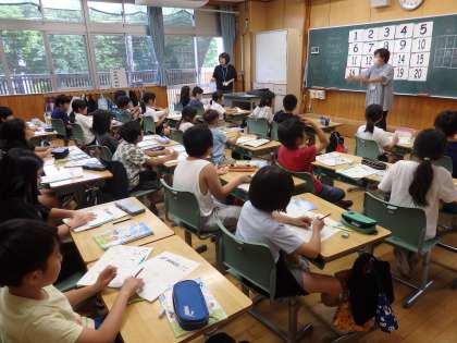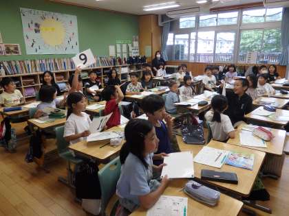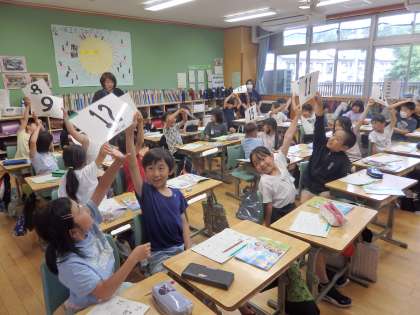 5/23 1〜20までの数 公開日 2024/05/23 更新日 2024/05/23 国際科 3年生の5時間目は国際科の授業でした。まずは、ALTの先生と「s」と「a」と「t」の発音についての学習です。「エス」「エイ」「ティー」ではなく「ス」「ア」「ロゥッ」という発音になります。その後、1〜20までの数字の学習をしました。1人1枚ずつ数字が書かれたカードが配られ、「1から20の歌」に合わせて、カードを上に上げていきます。最後はビンゴゲーム。英語の数字を楽しみながら、学習しました。 いいね(0)