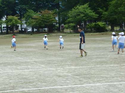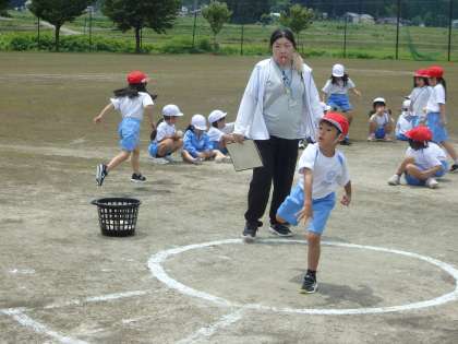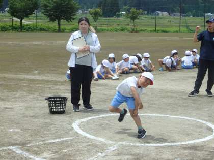 1,2年生の3時間目の体育、続いてはソフトボール投げの練習です。初めての1年生がまず投げます。2年生は、投げられたボールを一生懸命に走って、拾いに行っています。