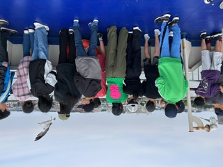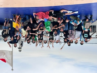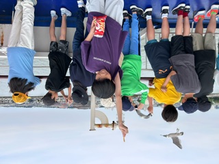 フェリーが出航しました。さっそくデッキに上がり、カモメにえびせんをあげています。