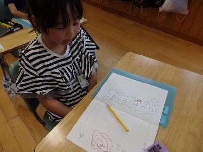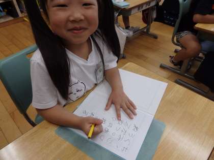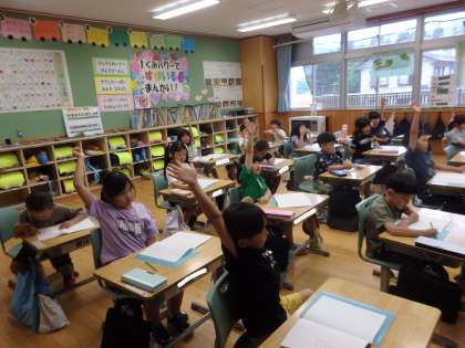 1年生の1時間目は国語の授業でした。「さとうとしお」の学習です。「砂糖を使っているおいしい物」を考え、2分間でなるべくたくさんノートに書く活動をしていました。チョコ、パンケーキ、アポロ、ケーキなどたくさん出てきました。