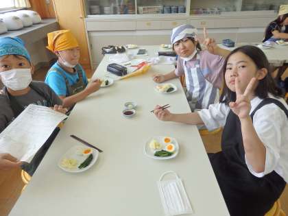 6/7 いただきます!1 公開日 2024/06/07 更新日 2024/06/07 教育活動 5年生の調理実習です。みんなで協力して、盛り付けをして、後片付けも終わったら「いただきます!」 いいね(0)