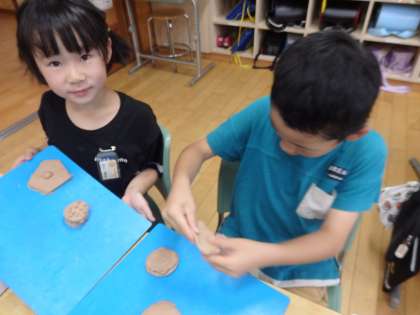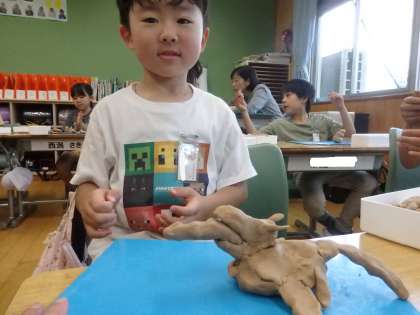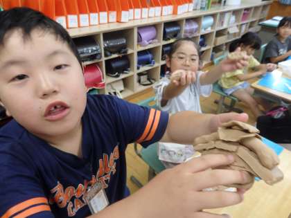 2年生の5時間目は図工の授業でした。「にぎにぎねん土」で、ねん土を握ってできた形を利用して好きなものを作ってました。ホットケーキ、枝豆、ハンバーガーを横から見たところ、炎をはくドラゴンなど発想豊かな作品ばかりでした。