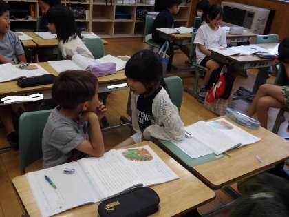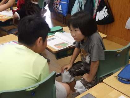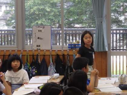 3年生の5時間目は国語の授業でした。「ワニのおじいさんの宝物」の学習です。ワニのおじいさんとオニの子どもの会話で、「お前は宝物を知らないのかい?それじゃあ、宝物をお前にやろう。うん、やろう。」というワニのおじいさんのセリフがあります。どんな気持ちで言ったのか、なぜ、2回も繰り返したのかを考えるために、おじいさんになりきってペアでロールプレイをしてみました。本当になりきってやっているのが、表情からにじみ出てますね。
