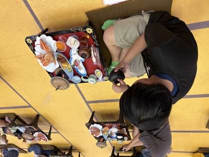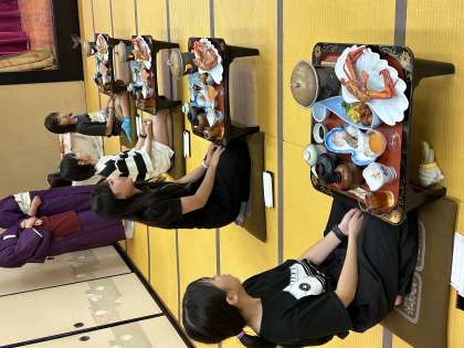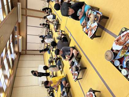 6年生の修学旅行、夕食会場に集まって、いただきます!