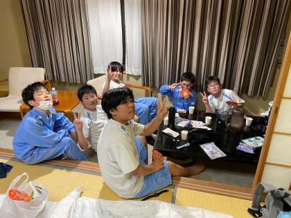 6年生の修学旅行、お土産タイムも終わり、しばし部屋で休憩タイムです。男子部屋です。