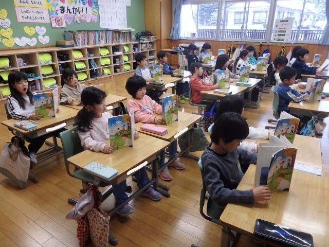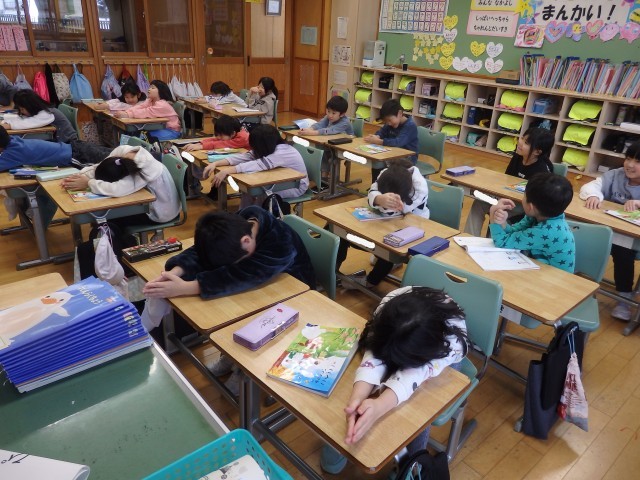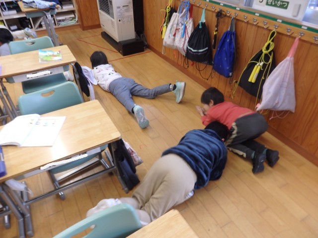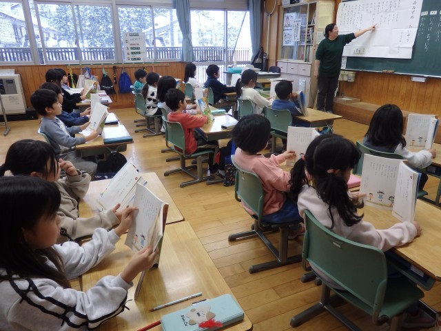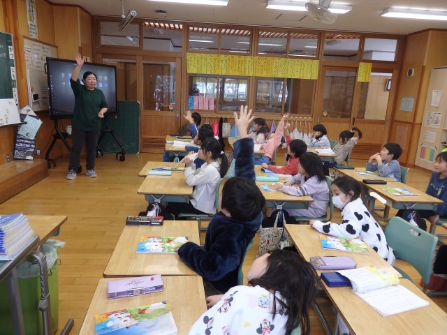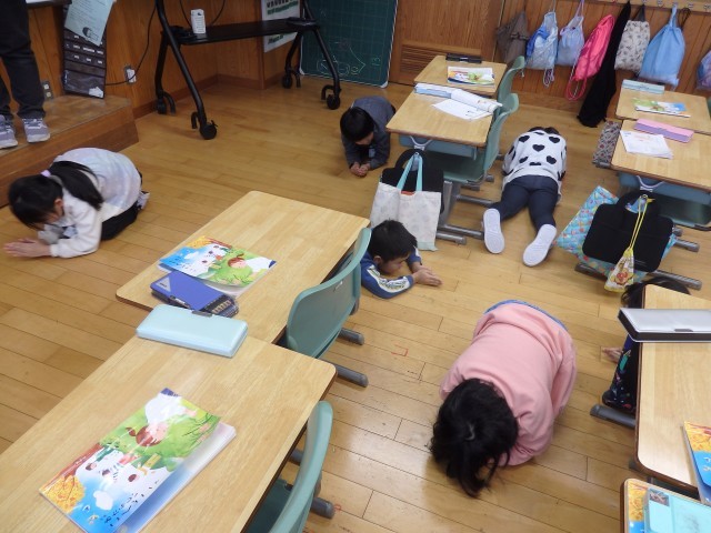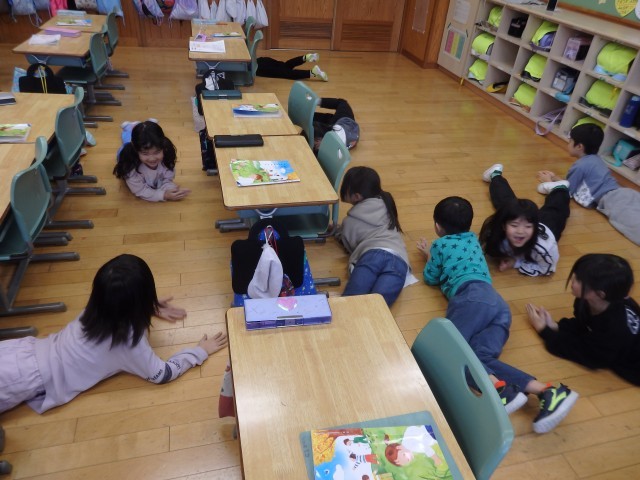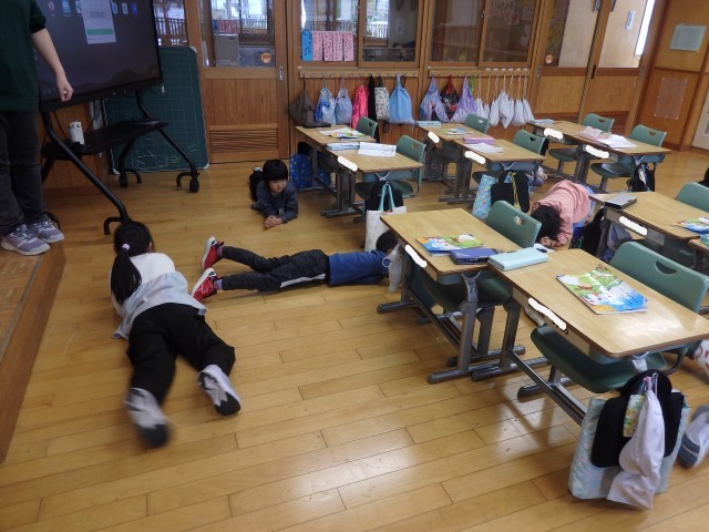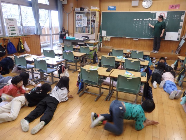 1年1組の4時間目は国語の授業でした。今日から「みみずのたいそう」という詩の学習になります。教科書を読む前に、まずはイメージを膨らませました。教科書に載っているミミズの絵だけを見て「どんな感じがするか」、自分の考えを発表していきました。「にょろにょろしている「長くなったり短くなったりする」「ぬるぬるしている」などが出されたところで、先生から【魔法】が掛けられ、実際にミミズになって体験してみました。イメージをつかんだところで、人間に戻って、音読をしていきました。