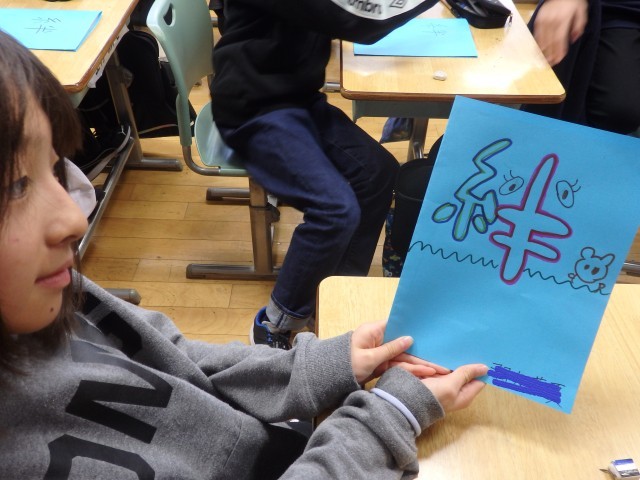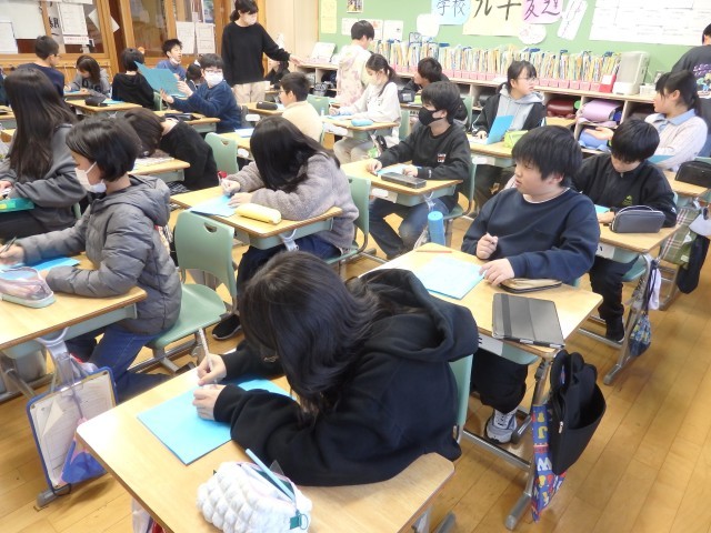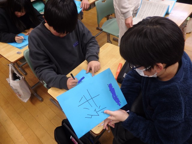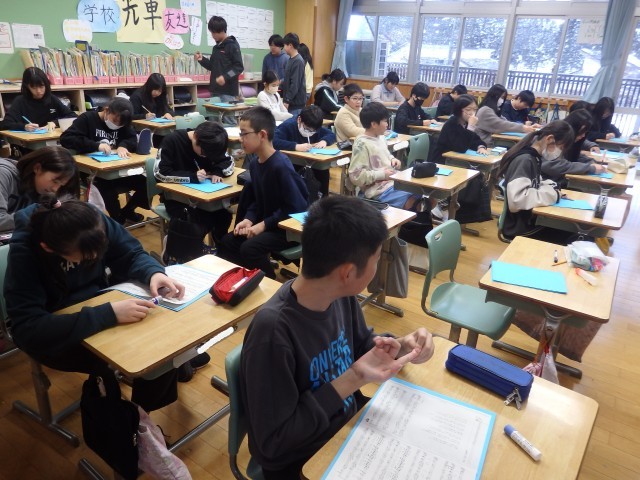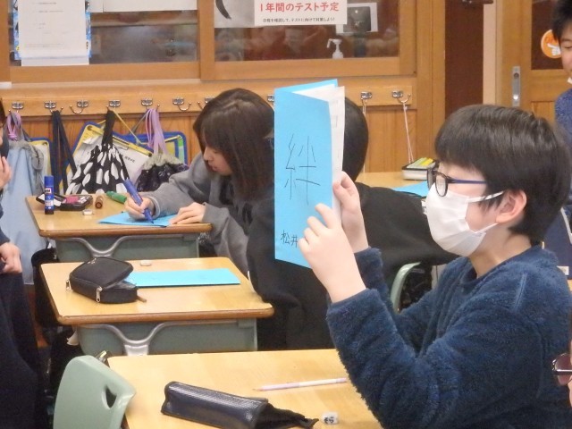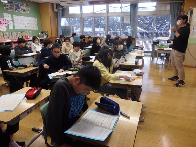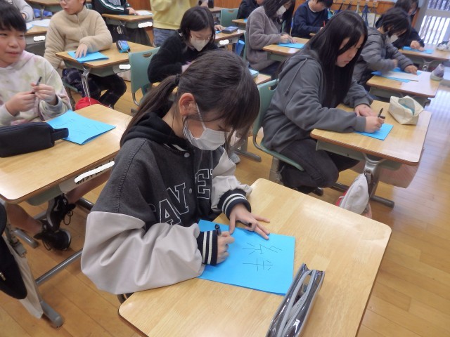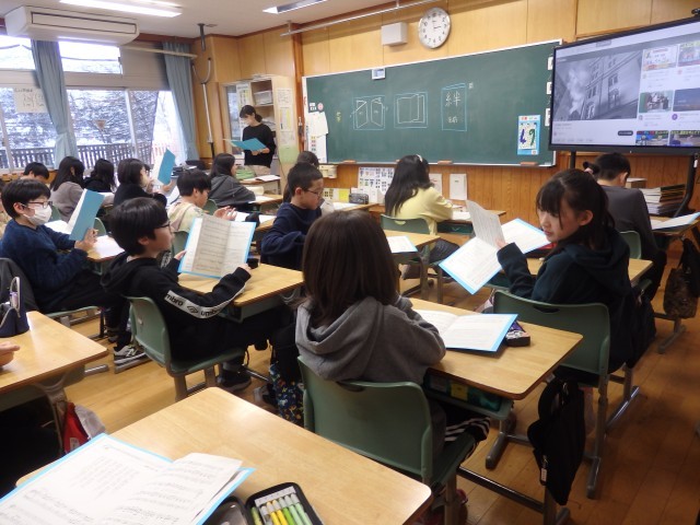 6年生の6時間目は音楽の授業でした。卒業合唱の準備をしていました。1人1人に楽譜が配られ、それを台紙に貼り、表紙にタイトルである「絆」を書きました。自分なりにデザインして書いている子がいました。また、書き終わって、画幅をジッと見ている子もいました。その後、合唱バージョンの曲を聞いて、音程の確認をしました。感動の合唱を期待しています!