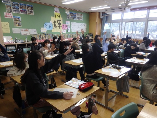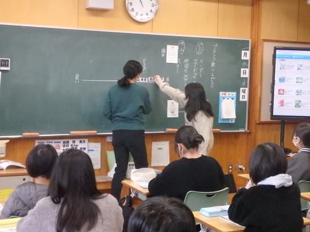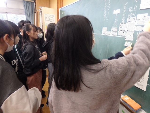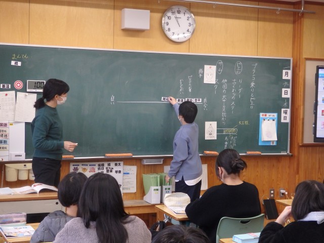 6年生の3時間目は道徳の授業でした。「ブランコ乗りとピエロ」という資料を読んで、「寛容・協力」について考えを深めました。サーカス団に古くからいるリーダーのピエロと他の大きなサーカス団からやって来たスター気取りのブランコ乗りについて、どれくらい良いか・良くないかを直線上に自分の考える場所にネームプレートを貼り、理由を発表していきました。最後に「自分と違う人と付き合うときにはどんなことが大切か」をプリントに記入しました。