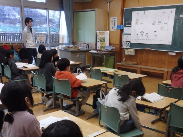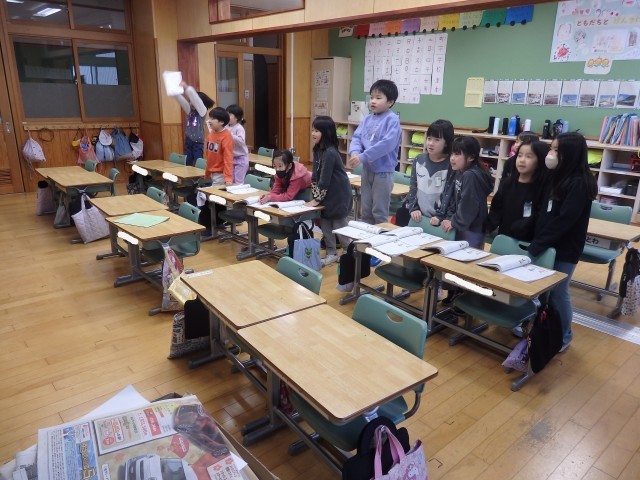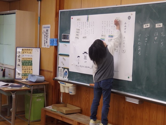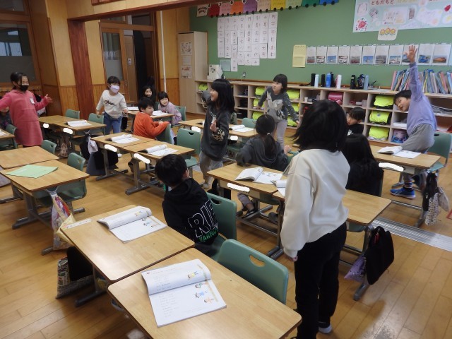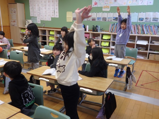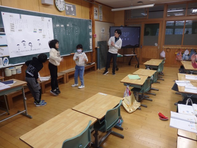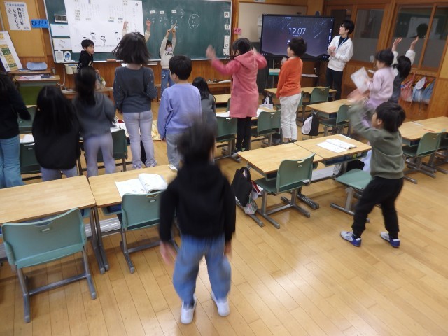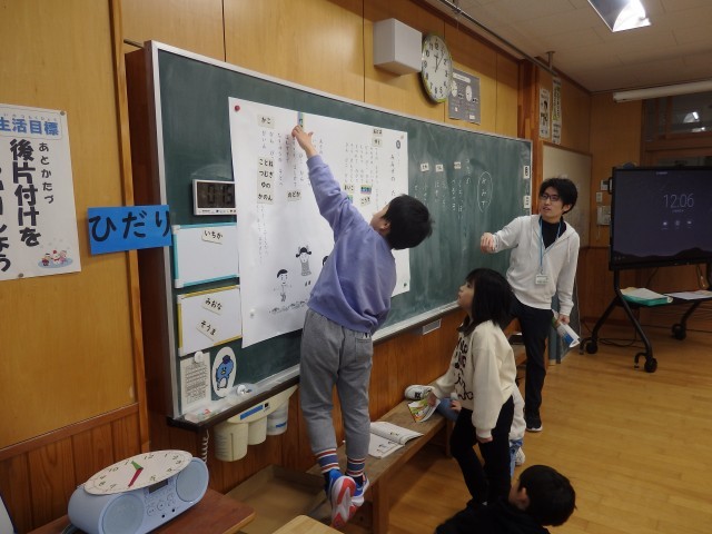 1/9 どの文がお気に入り? 公開日 2025/01/09 更新日 2025/01/09 教育活動 1年2組の4時間目は国語の授業でした。まずは昨日行った単元のまとめのテストが返され、赤えんぴつで直していきました。その後、「みみずのたいそう」という詩の学習です。読んでみて、気に入った文のところにネームプレートを貼っていきました。そして、それぞれの文をどんな動きを付けて読んだらいいのか考えを出し合い、みんなでやってみました。 +6 いいね(0)