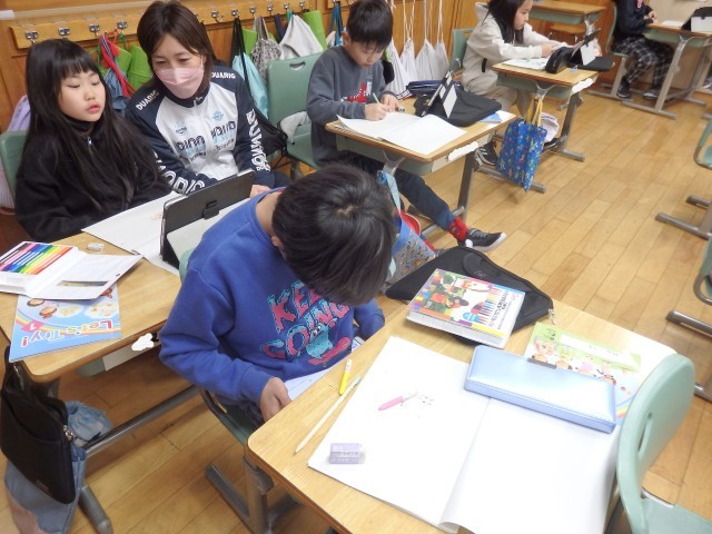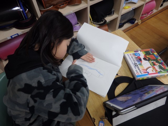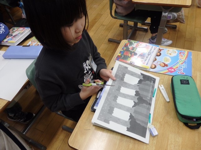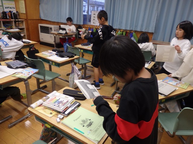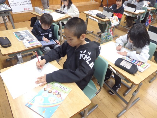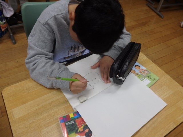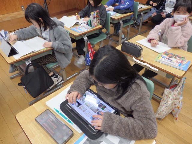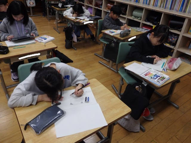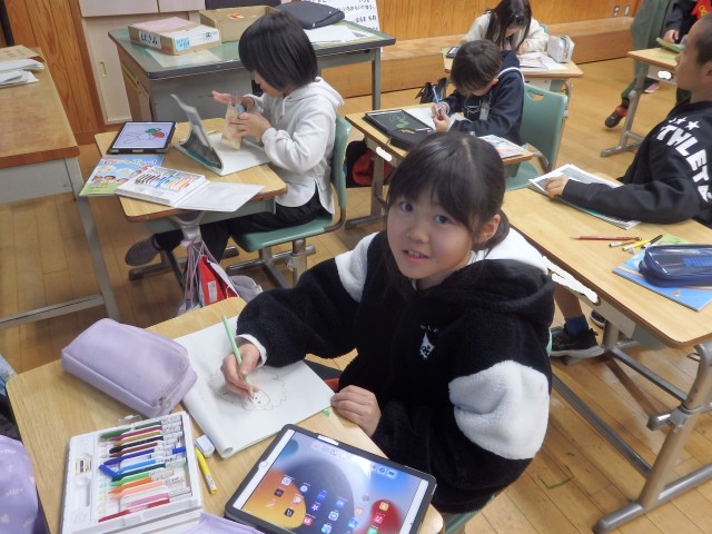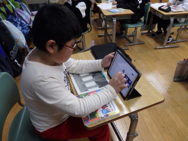 3年生の5時間目は国際科の授業でした。十二支の動物の英語での言い方を復習した後、動物クイズを作りました。自分が好きな動物の絵を描き、もう1枚の森の絵の木のすきまから一部分だけをみんなに見せてクイズにします。iPadで画像検索しながら、一生懸命に絵を描いていました。