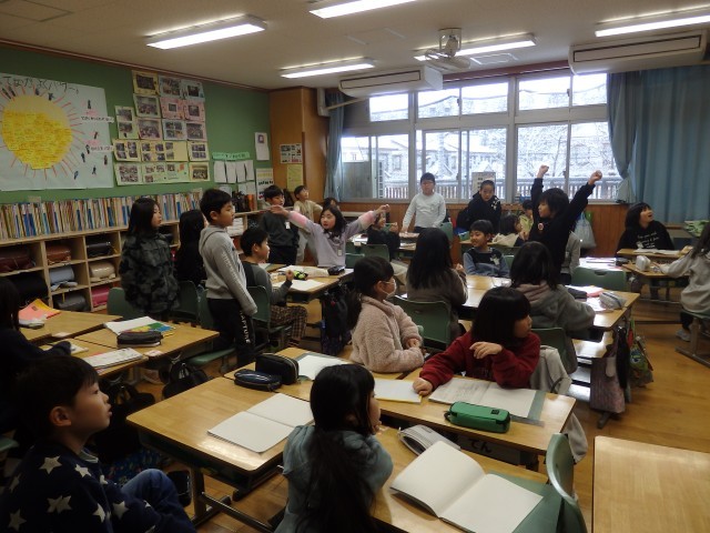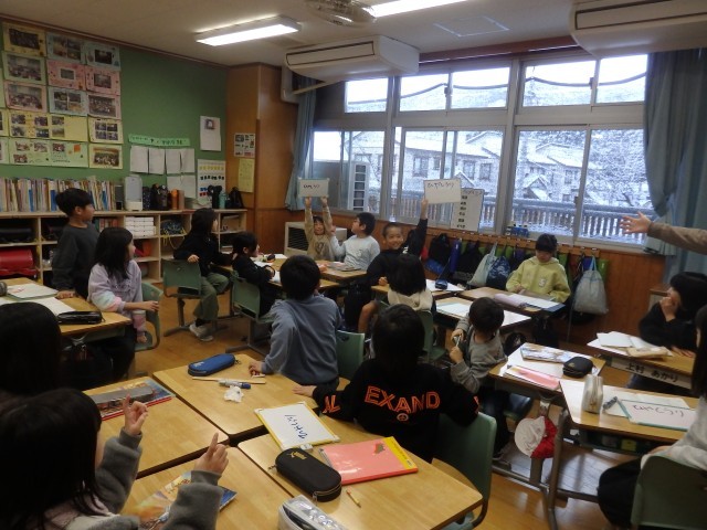 1/10 俳句クイズ 公開日 2025/01/10 更新日 2025/01/10 教育活動 3年生の1時間目は国語の授業でした。俳句の学習です。教科書に出てきた俳句を班で協力して覚え、俳句クイズを行いました。先生が最初の五・七まで読み、残りの五を班ごとで協力して思い出してホワイトボードに書きます。どの班が優勝したでしょうか。 +6 いいね(0)