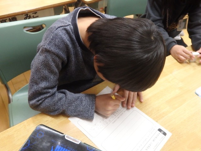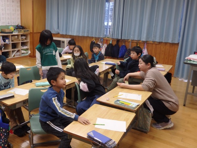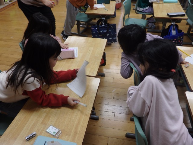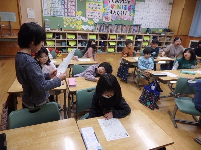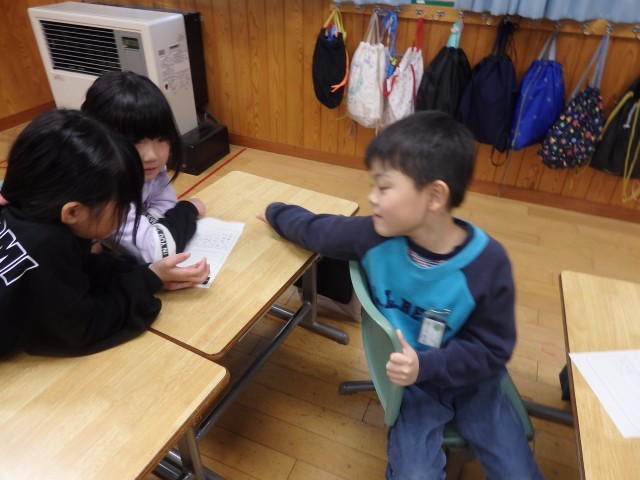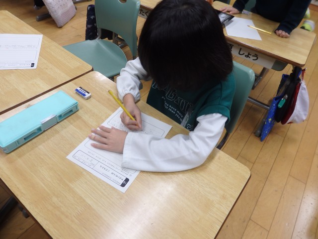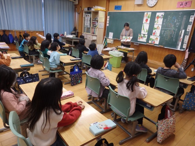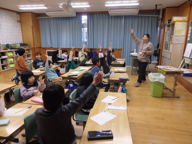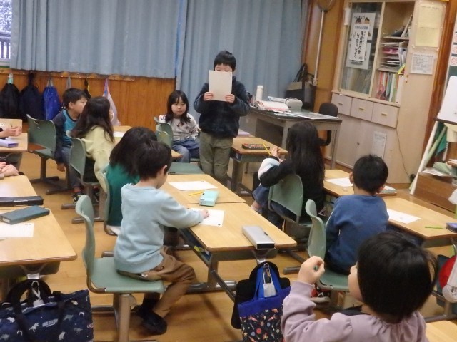 1年1組の2時間目は道徳の授業でした。「やさい村の子どもたち」という資料から思いやりについて考えました。先生が紙芝居形式でお話を読みます。「ナスとトマトとキュウリが遊んでいます。そこへニンジンと落花生が入れて欲しいとやって来ましたが、土がつくとイヤだからと断りました。悲しそうな顔のニンジンと落花生・・・」と先生が読み終わるや「最悪」とつぶやく子がいました。最後の場面でナスのある一言でニンジンと落花生が笑顔になりますが、そのナスの一言を考え発表しました。