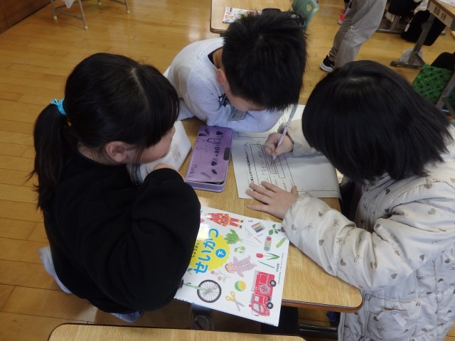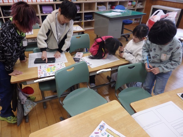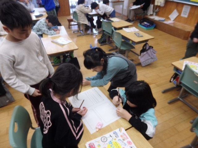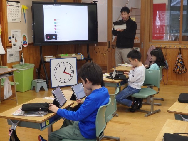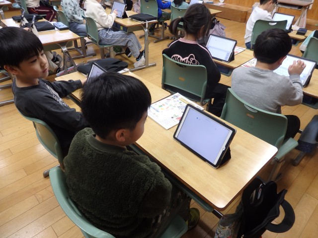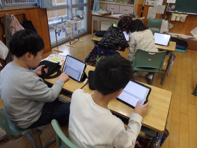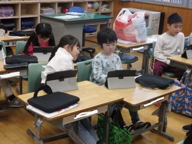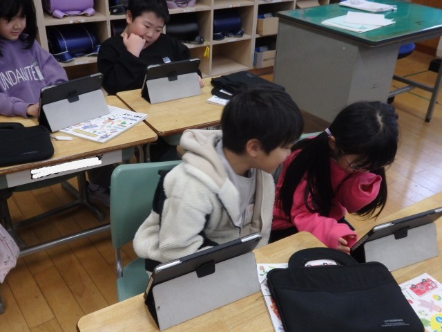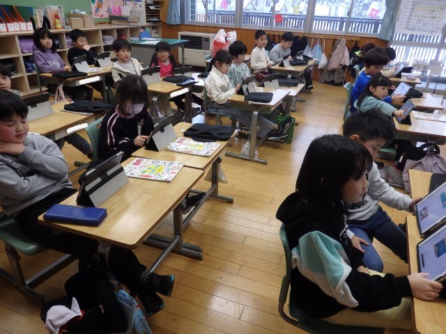 2年生の3時間目は生活の授業でした。前半は、インフルエンザが流行ってきたこともあり、グーグルクラスルームというアプリを使ってオンライン授業の練習をしていました。ログインして先生からのコメント「好きな食べ物は何?」に対してコメントを返したり、実際にカメラ機能を使って授業を受けるやり方を学びました。後半は「おもちゃ広場」の計画を立てました。動くおもちゃが完成したので、同じおもちゃを作った人で集まって、他の人が楽しめるようにルールや遊び方について話し合いました。