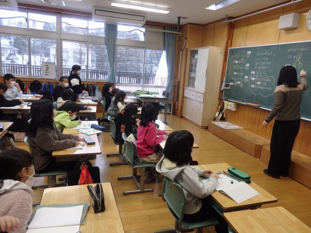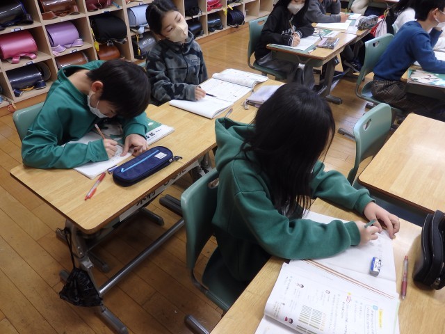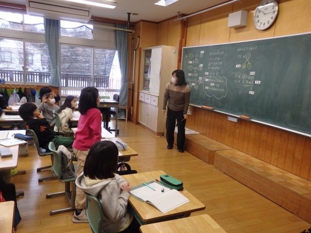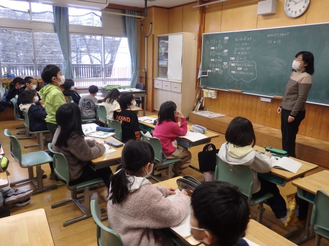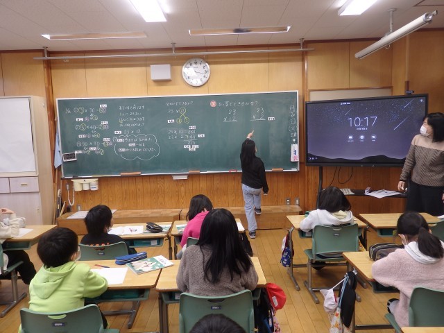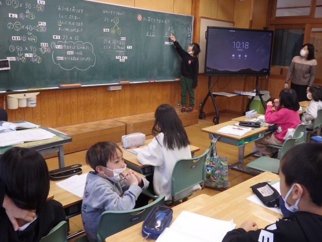 1/14 2けたのかけ算 公開日 2025/01/14 更新日 2025/01/14 教育活動 3年生の2時間目は算数の授業でした。2けたのかけ算の学習です。「折り紙を23枚ずつ12人に配ります。何枚必要ですか」という問題に取り組んでいました。「1年生でやった『サクランボ算』でやったらいいんじゃない?」という考えが出され、12を10と2に分けて計算していきました。その後、筆算でのやり方を学びました。 +6 いいね(0)