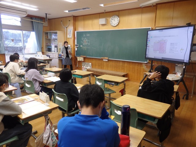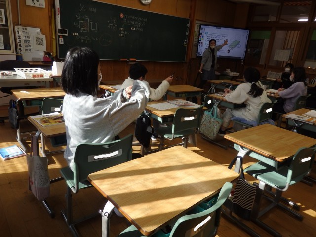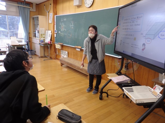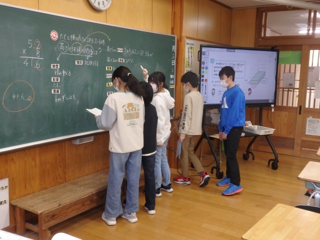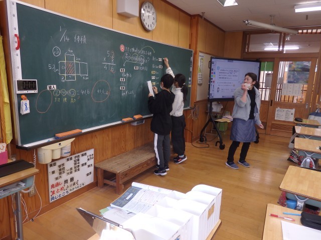 5年生の3時間目は算数の授業でした。体積の学習です。「縦5cm、横3cm、高さ1cmの直方体を1つずつ積み重ねていきます。高さと体積の関係は?」という問題に取り組んでいました。真っ先に「比例!」という考えが出されたので、確かめるために1段から10段までのそれぞれの体積を求めていきました。