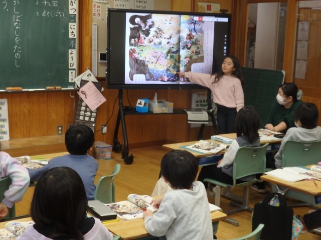 1/16 いろいろな声で 公開日 2025/01/16 更新日 2025/01/16 教育活動 1年1組の1時間目は国語の授業でした。まずは「みみずのたいそう」の音読をしました。お兄さんの声、おじいさんの声、王様の声、時計の声など、いろいろな声で読んでいきました。子ども達も楽しそうに音読していました。その後、漢字の「田」と「千」の学習をしたり、昔話の学習をしました。 +6 いいね(0)