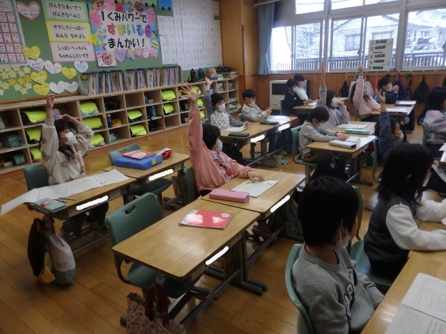 1年1組の3時間目は生活の授業でした。お家の仕事を誰がどんなことをしているのかを宿題で調べてきたことを発表していました。その中で「玄関の靴並べ」について、「うちは壁の方に揃えるからやらない!」という子がいたので、みんなの前で紹介してもらいました。洗濯、料理、弟妹の世話、片付け掃除とたくさんの仕事が出されましたが、その中から1つ「自分ができること」を選びました。どうやら今週末に挑戦して、その様子をお家の人から動画で撮ってもらうのが宿題になるようです。