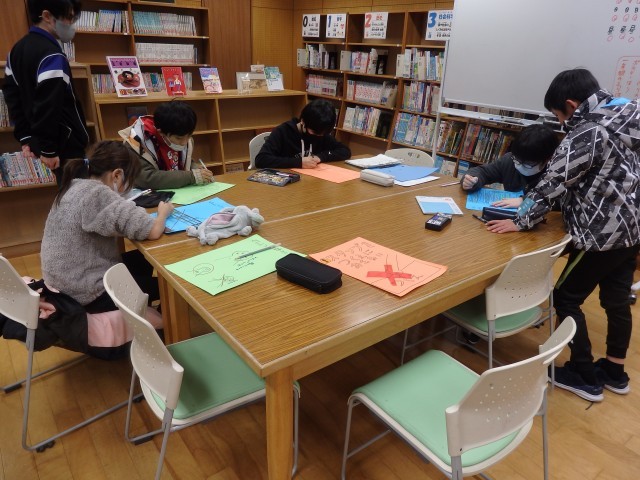 振り返りが終わった後、保健委員会はシャボネットや消毒用アルコールの補充、図書委員会はマナー良く図書室を使ってもらうためのポスター作り、生活委員会は2学期に行った「あいさつの木」活動の表彰状の印刷をしていました。