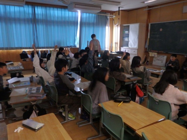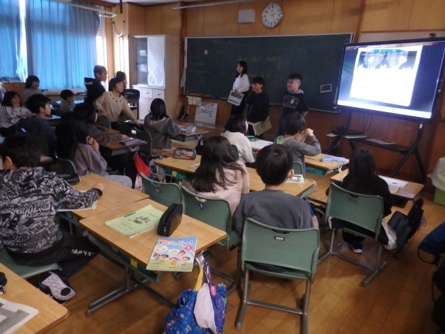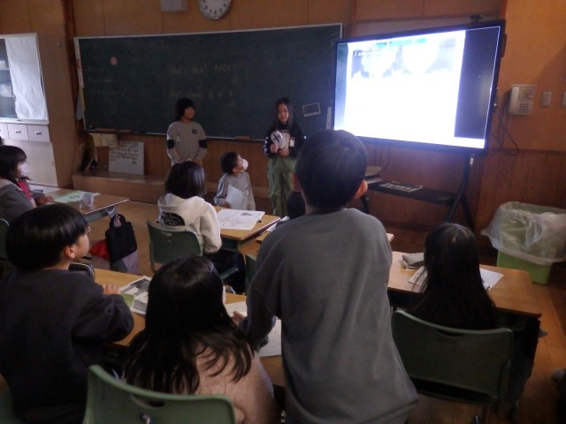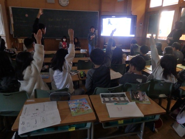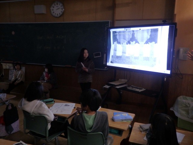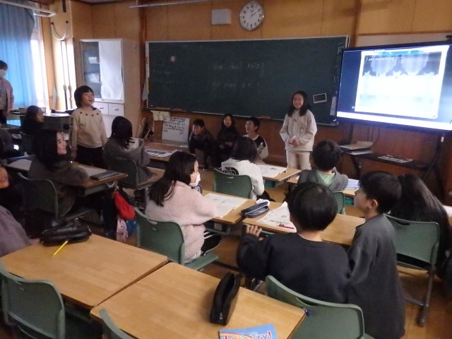 1/23 「これなんだ?」クイズ 公開日 2025/01/23 更新日 2025/01/23 国際科 3年生の5時間目は国際科の授業でした。まずはALTの先生と「ai」の読み方を学習しました。その後、「これなんだクイズ」を行いました。前の授業で1人1人が好きな動物の絵を描きました。クイズでは森の木の間から少しだけ動物の姿をみんなに見せて「What's this?」と問題を出します。さすがに一部しか見えていないので難しいですね。 +5 いいね(0)