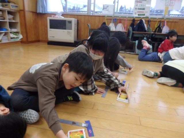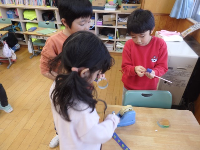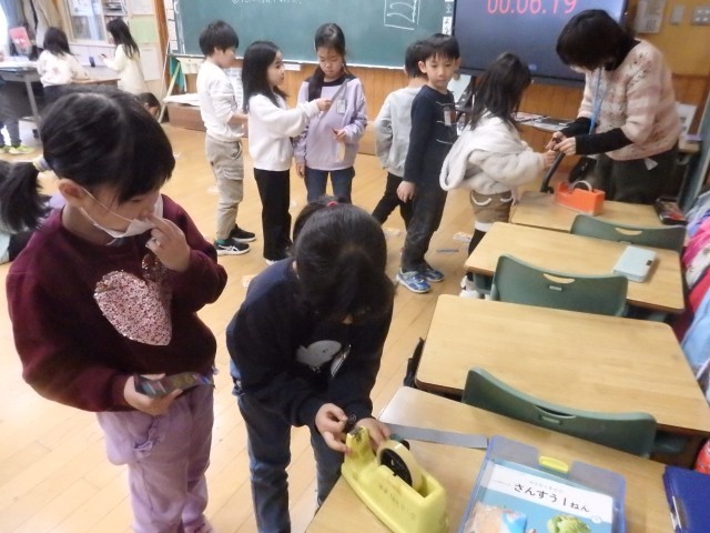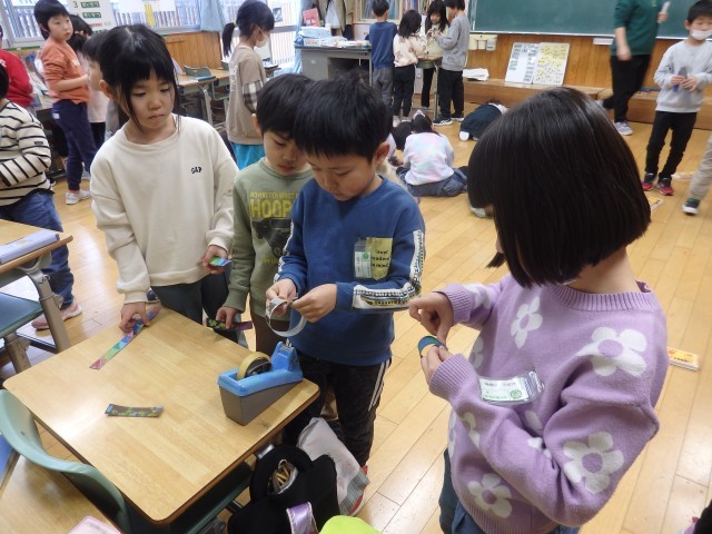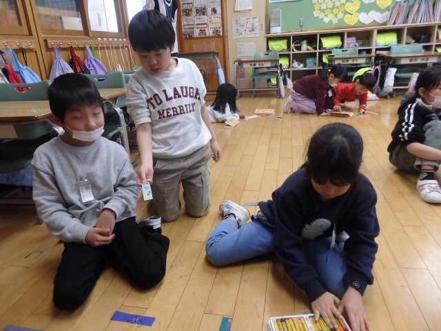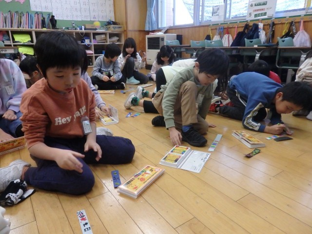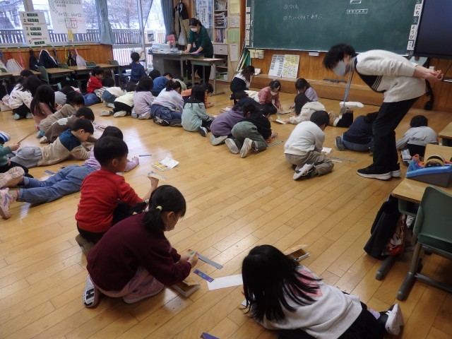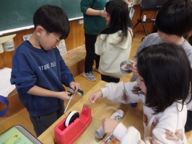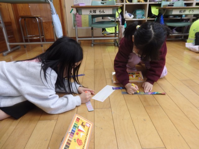 1年生は1,2組合同で3,4時間目に生活の授業を行いました。「冬の遊びを楽しもう」という学習です。今日は屋内でできる遊びでした。3時間目には飛行機を作りました。画用紙で大小2つの輪を作り、それをストローに貼り付けます。ストローの輪が翼、ストローが胴体になるわけです。