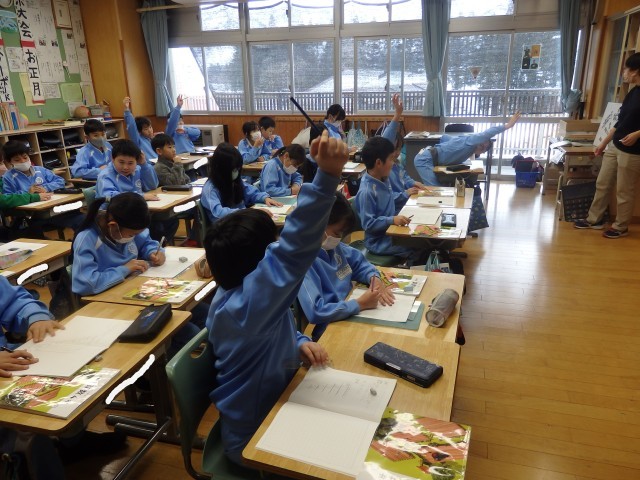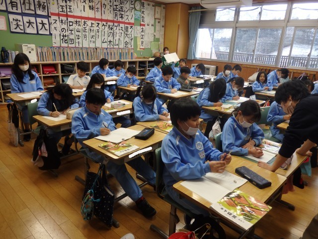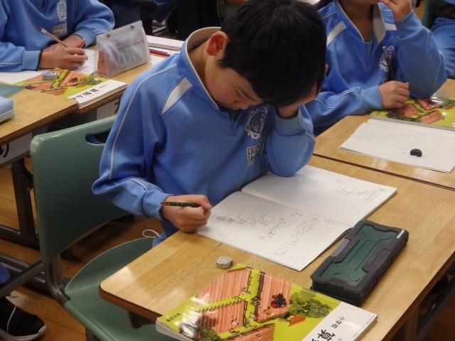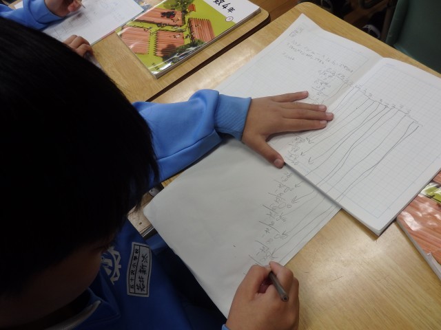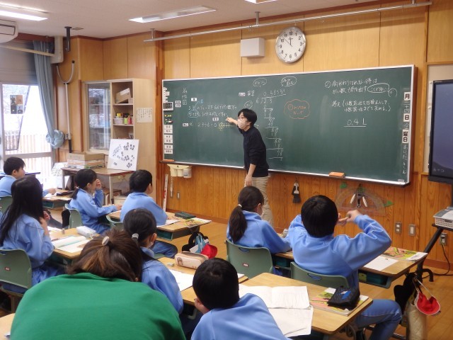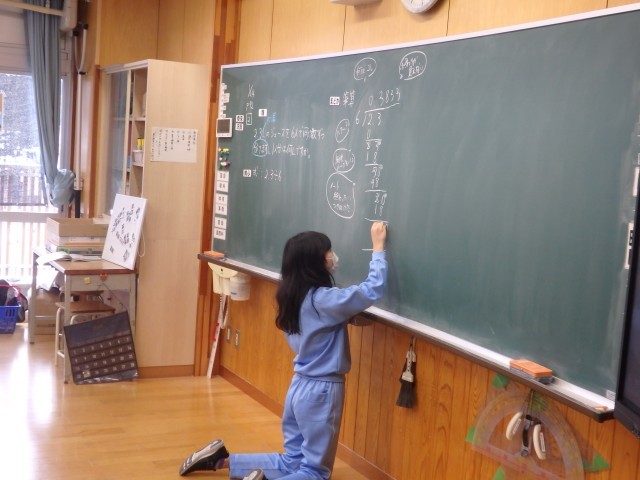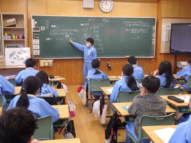 4年生の4時間目は算数の授業でした。小数の割り算の学習です。「2.3Lのジュースを6人で同じ分量で分けます。1人分は何Lですか」という問題に取り組んでいました。計算すると、0.38333・・・と3が永遠に続きます。黒板には先生と子ども達のやり取りで出てきた「はあ~?」「終わりが見えない」「何だこれ?」といったつぶやきが書かれています。ノート1ページだけでなく、別な紙を付け足してひたすら計算している子もいました。割り切れないときは、四捨五入してがい数を求めることを学びました。