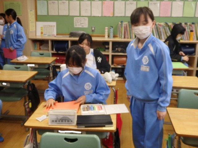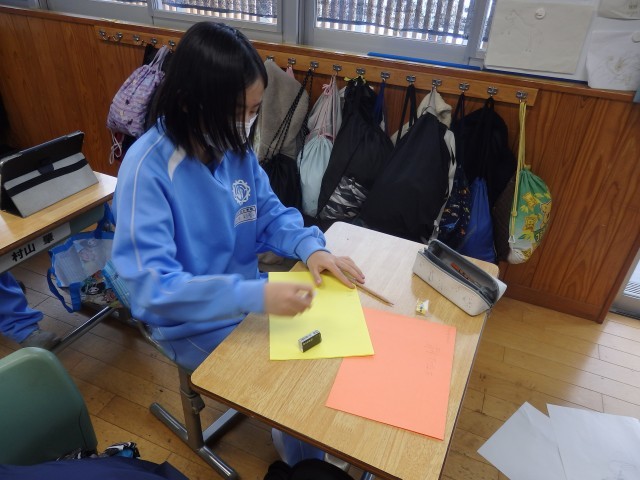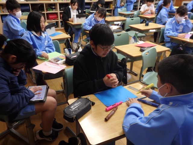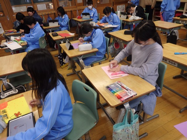 1/24 六送会の準備 公開日 2025/01/24 更新日 2025/01/24 教育活動 5年生の4時間目は六送会の準備をしていました。きずな班のメンバーで6年生1人1人に書くメッセージカードを貼る台紙の飾り付けをしていました。表紙には送る6年生の趣味や好きなもの、卒業証書や桜の花などの絵をていねいに描いていました。 +7 いいね(0)
