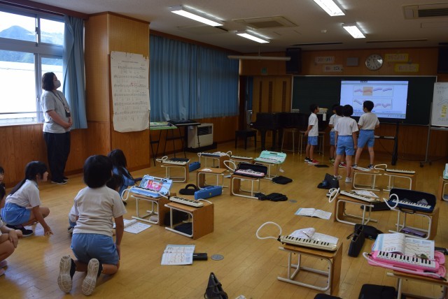 2年2組は音楽で、「繰り返しのおもしろさ」を感じる学習です。主旋律に合わせて、鐘の音を表現する旋律を繰り返して重ねます。自分たちで考えた言葉を旋律にのせて表現しました。グループ同士のなめらかなつなぎも大切です。違う旋律を重ねる楽しさも味わいました。