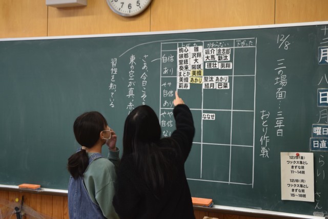 12月の生活目標は「友達のよさを見つめよう」です。様々な行事で児童にとっても忙しかった10月11月を終え、仲間とのつながりや成長を感じることができました。同時に、仲間との距離もさらに近くなって心ない言葉を言ってしまったり、分かっているつもりで言葉が足りなかったりすることですれ違いが出てくることがあります。この時期に互いの成長やがんばりを認め合ったり、感謝の気持ちを伝えたりすることで、温かい気持ちで生活することができます。