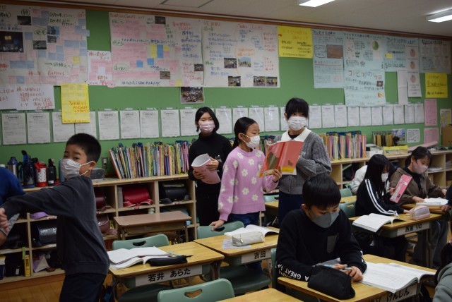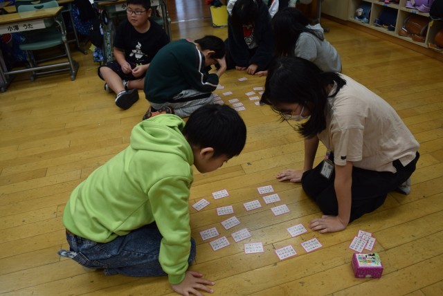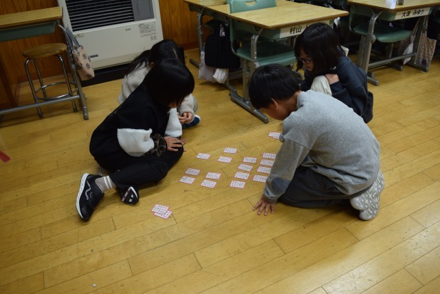 五十沢小学校では、「五色百人一首」を取り入れて20枚の札を取り合うことで、繰り返しゲームをし早く覚えたりルールに慣れたりしています。
