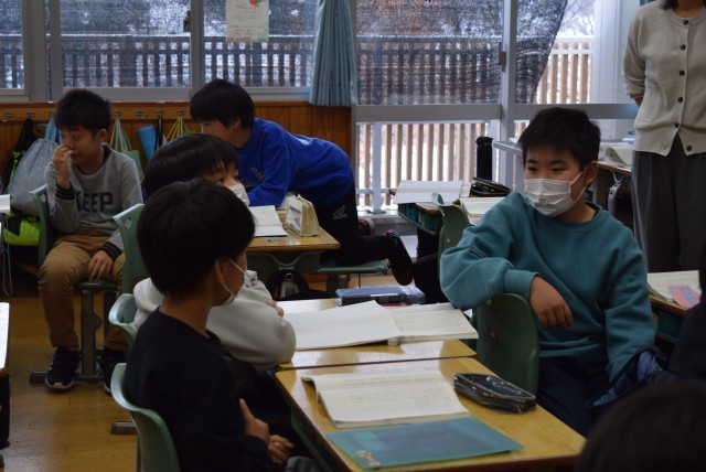 いつもと違って、友達との距離がとても近いですが、しんと静まって落ち着いて書き初めの練習を行いました。端に追いやられた教卓が、少しさみしそうでした。