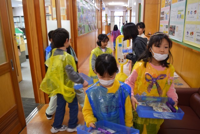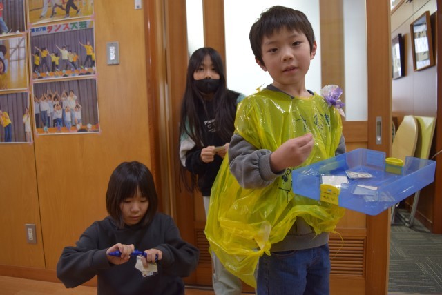 種は一人2袋までで、もらった人は、1年生が着ているビニールのお洋服にサインをすることにしました。一つ一つの袋には、丁寧に絵やメッセージが書かれています。大勢の全校の人が1年生からのプレゼントとメッセージを受け取りました。