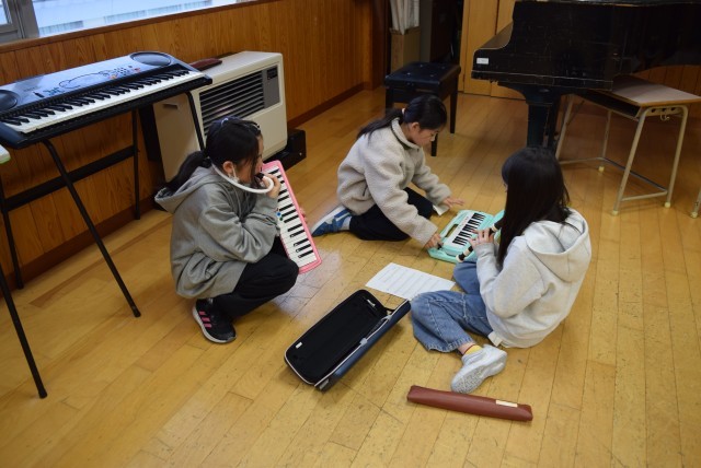 6年生から5年生に移杖された鼓笛隊。次の担い手は4年生です。主旋律を鍵盤ハーモニカで吹く練習が始まりました。