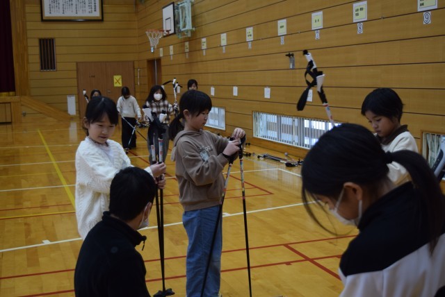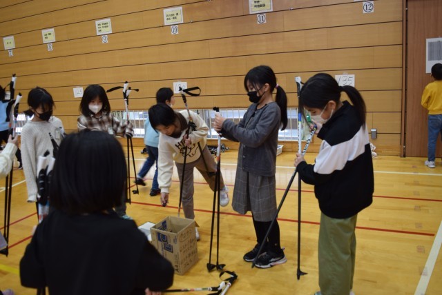 4年生の人数分のアルペンスキーの靴と板、ストックを用意して履く練習もしてくださいました。