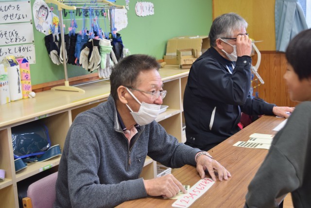 2年生は、ボランティアの方と一緒に九九練習に取り組んでいます。「こんなにシールをもらえたよ」「あと、こことここだけ」と、1~9の段のあがり九九(✖1~✖9)下がり九九(✖9~✖1)バラバラ九九(アットランダム)それぞれの合格したシールを見せてくれました。「6の段が苦手なんだ」と繰り返し並んで、ボランティアの方に聞いてもらいました。