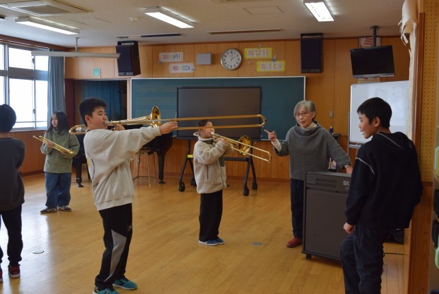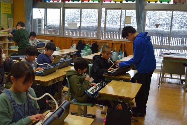 鼓笛の引継に向けて6年生が4,5年生に教える活動をしています。5年生で、6年生がこれまでやっていた楽器を引き継ぎ、新しい楽器を手にする児童がいます。4年生でリコーダー、鍵盤ハーモニカを担当する児童が教え合います。4年生で大きな楽器に挑戦する児童がいます。限られた時間の中で習得することはとても難しいですが、6年生は自分がしてもらったように、そして、誇りをもって下級生に教え伝え、4,5年生は難しい音やリズムにも、諦めずに繰り返し真剣に練習していました。とても素敵な姿でした。