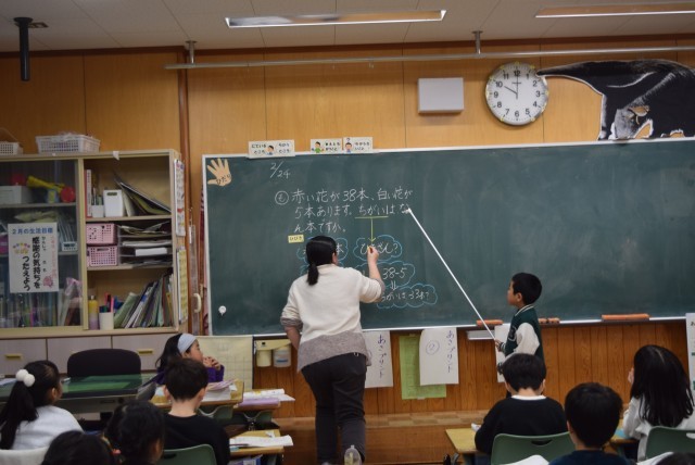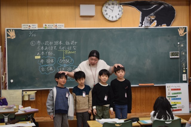 1年生は、この問題文は、たし算かひき算かを考える場面でした。38-5です。ずいぶん難しいひき算ができるようになったなと感心していると、「なぜひきざんなの。」とわからなさを話してくれた児童がいました。「どうしてひきざんか言える人いますか」と担任が尋ねると、次から次へと発言し、ひきざんである理由を話してくれました。「ちがいを調べるときは、ひき算」ということを忘れてしまった児童に、わかるまでみんなで考え合う姿が、素敵でした。
