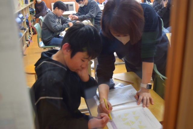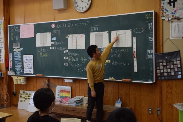 5年生は、見取り図の書き方のコツを見つけ合う学習でした。コンパスを使ってもうまく曲線を表せないこと、マス目を利用することなど、言葉にして説明することで図の特徴を明らかにしていくのだなと感心しました。