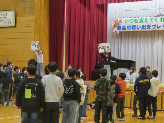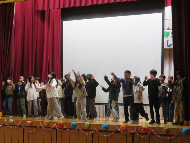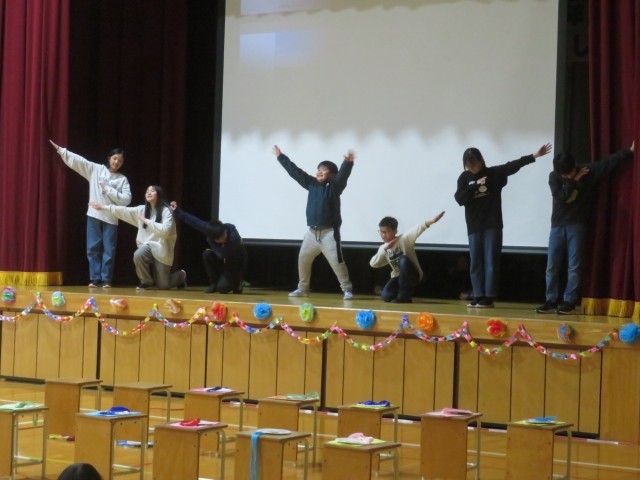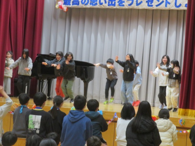 プログラムの最後には5年生が6年生一人一人について、思い出と感謝を伝えました。「○○さん、委員会の時に教えてくれてありがとう」など、一人一人がエピソードを語って感動的でした。「好きすぎて・・・」とダンスも良かったです。