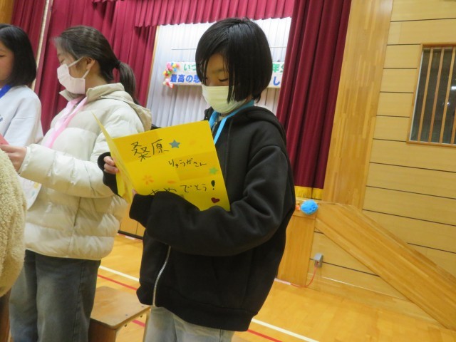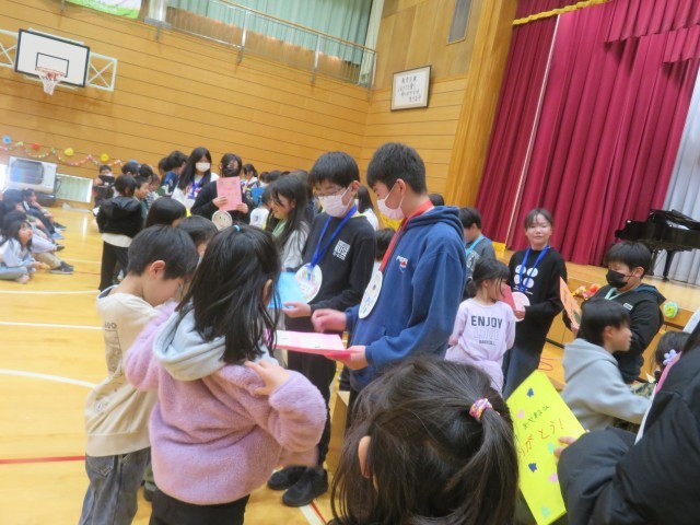 縦割り班のメンバーでつくったメッセージカードを1年生から受け取る姿は、本当に微笑ましく、リーダーとしてがんばってきたことが報われる瞬間だったと思います。