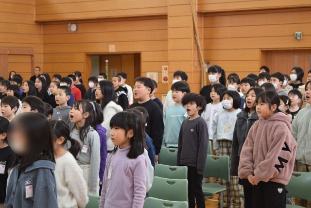 また、普段の全校朝会から、良い姿勢で話を聞くこと、前に立つ人が礼をしたら礼をすること、立っていても体が動かないようにすることなどをしっかり行っていくことで、いざというときには、自然にできるようになっています。だから、全体で式の練習をしても短時間で良い形で行うことができるのです。歌も同様。普段から良い声で歌う五十沢小学校の子どもたち、特別な練習を必要としません。ありがたいなと思います。